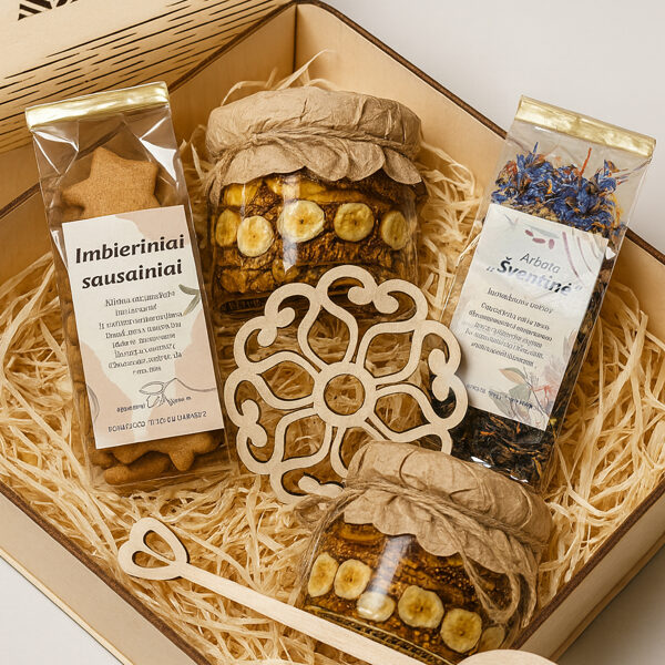 Padėkliukų, dėžučių ir dekoratyvinių verpsčių ornamentai sukurti remiantis lietuvių liaudies tautinių raštų motyvais. Stilizuoti augalų ir gyvūnų raštai perteikti per geometrines formas, neperkrautas detales ir dailiai išpildytais fragmentais sudaro puikų šiuolaikiškumo ir senosios istorijos ansamblį.